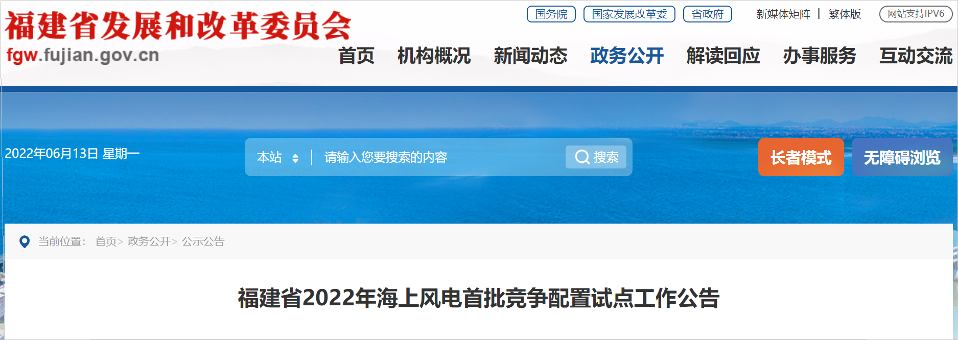 On June 13, 2022, in accordance with the relevant policies and regulations of the National Development and Reform Commission and the National Energy Administration on the competitive allocation of offshore wind power, the "Reply Letter of the General Department of the National Energy Administration on the Planning of Offshore Wind Power in Fujian Province" (Guoneng Comprehensive Letter Xinneng [2022]) No. 26) and the "Fujian Province Offshore Wind Power Market-oriented Competitive Allocation Pilot Program" agreed by the provincial government, the Fujian Provincial Development and Reform Commission issued the "Fujian Province 2022 First Batch of Offshore Wind Power Competitive Allocation Pilot Work Announcement".