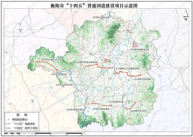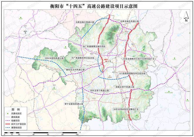 4.常宁至新田高速公路:起于常宁市西侧,接S71华常高速,往南经兰江、洋泉、塔山、门楼、金陵至新田县城东侧与S92桂新高速相接,衡阳境内约60km。