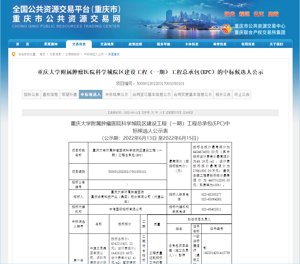 On June 13, 2022, the Chongqing Public Resource Trading Network released the announcement of the winning candidates for the EPC, the general contracting project of the first phase of the construction project of the Science City Campus of Chongqing University Affiliated Cancer Hospital. , Shenzhen General Institute of Architectural Design and Research Co., Ltd., the bid price is 4.34 billion yuan, and the total project investment is about 5.736 billion yuan.