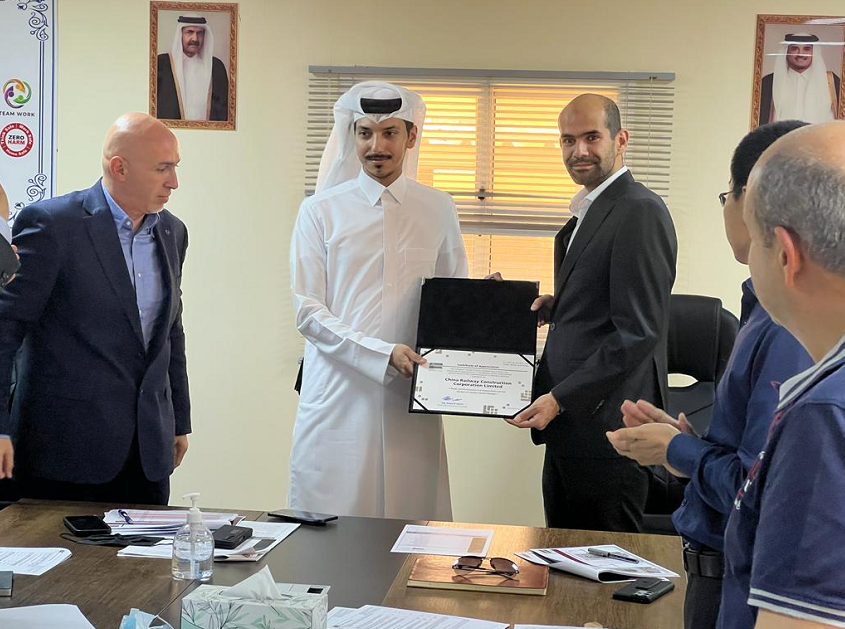 卡塔尔公共工程局项目经理向我方项目总监颁发工人福利杰出表现奖荣誉证书