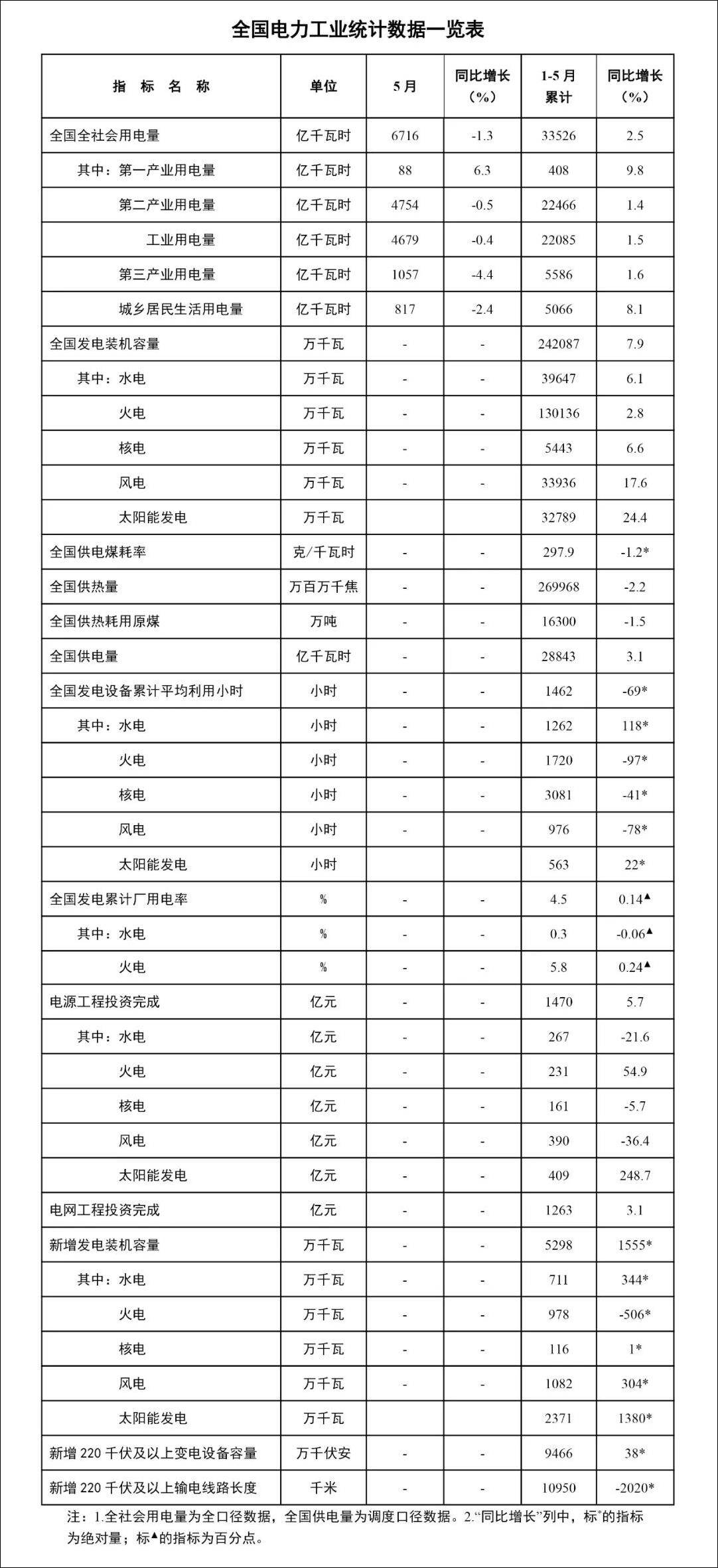 2022年6月16日,中国国家能源局发布1-5月份中国电力工业统计数据。截至5月底,中国发电装机容量约24.2亿千瓦,同比增长7.9%。其中,风电装机容量约3.4亿千瓦,同比增长17.6%;太阳能发电装机容量约3.3亿千瓦,同比增长24.4%。