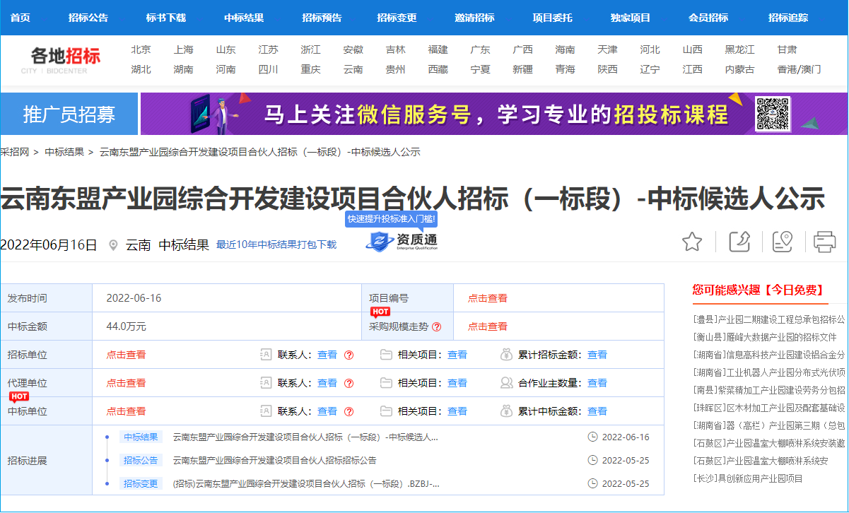 On June 16, 2022, the Yunnan Provincial Public Resource Transaction Information Network released the announcement of the successful bidder candidates for the comprehensive development and construction project of the Yunnan ASEAN Industrial Park. The company won the bid, the second bid section was won by China Railway Eighth Bureau Group Co., Ltd. and China Railway Trust Co., Ltd., and the third bid section was won by China Fifth Metallurgical Group Co., Ltd. and AVIC Trust Co., Ltd.
