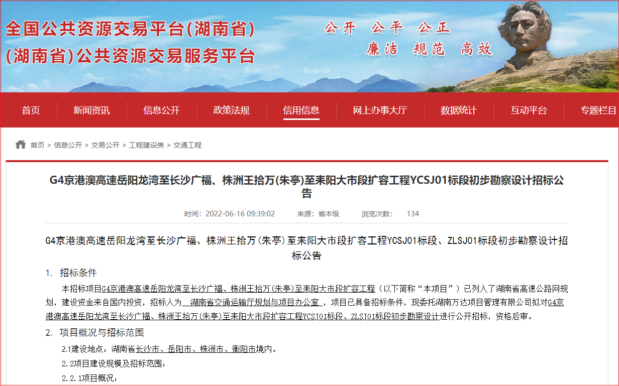 近日,湖南省交通运输厅在湖南省公共资源交易中心发布招标公告,招标内容显示,G4京港澳高速岳阳龙湾至长沙广福段扩容工程将正式启动初步勘察设计招标,招标人湖南省交通运输厅规划与项目办公室,项目总投资约104.3亿元。