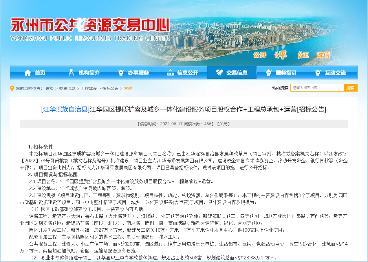 On June 17, 2022, the Public Resources Trading Center of Yongzhou City, Hunan Province released the equity cooperation + general contracting + operation bidding announcement of Jianghua Park's quality improvement and expansion and urban-rural integration construction service project, the industry housing construction, the tenderer Jianghua Fengcheng Development Group Co., Ltd., with a total investment of 2.82 billion yuan.