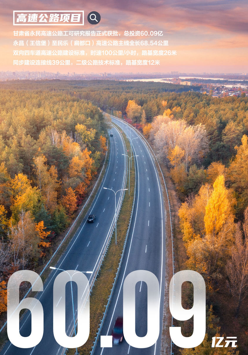 该项目起点位于永昌县王信堡,设枢纽互通与G30连霍高速公路相接,路线由东向西设,终点位于民乐县扁都口王家窑,设枢纽互通与G0611张汶高速公路相接,主线路线全长68.54公里,采用双向四车道高速公路技术标准,设计速度100公里/小时,路基宽度26米,共设置桥梁1999米/24座,涵洞218道。同步建设连接线39公里,采用二级公路技术标准,路基宽度12米,项目估算总投资60.09亿元。