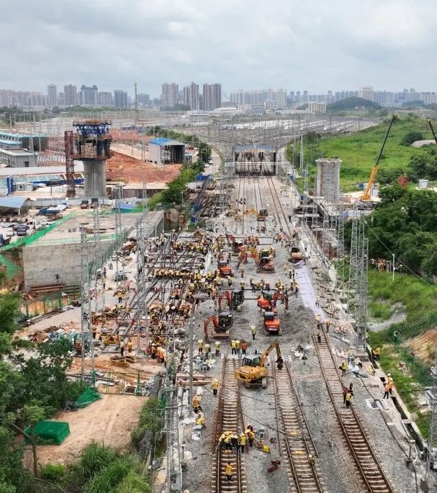 近日,中铁五局贵南项目部近400名施工人员经过420分钟连续作业,圆满完成了南宁动车所南钦、南广动车右线线路拆除插铺120/122/124/126/128/130/132号一渡一交组合道岔Ⅱ级封锁施工,安全、正点开通线路,从而拉开了南宁动车所第二阶段改造施工序幕。