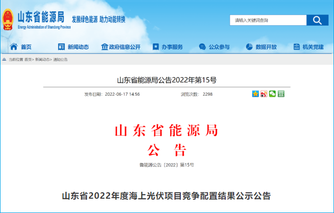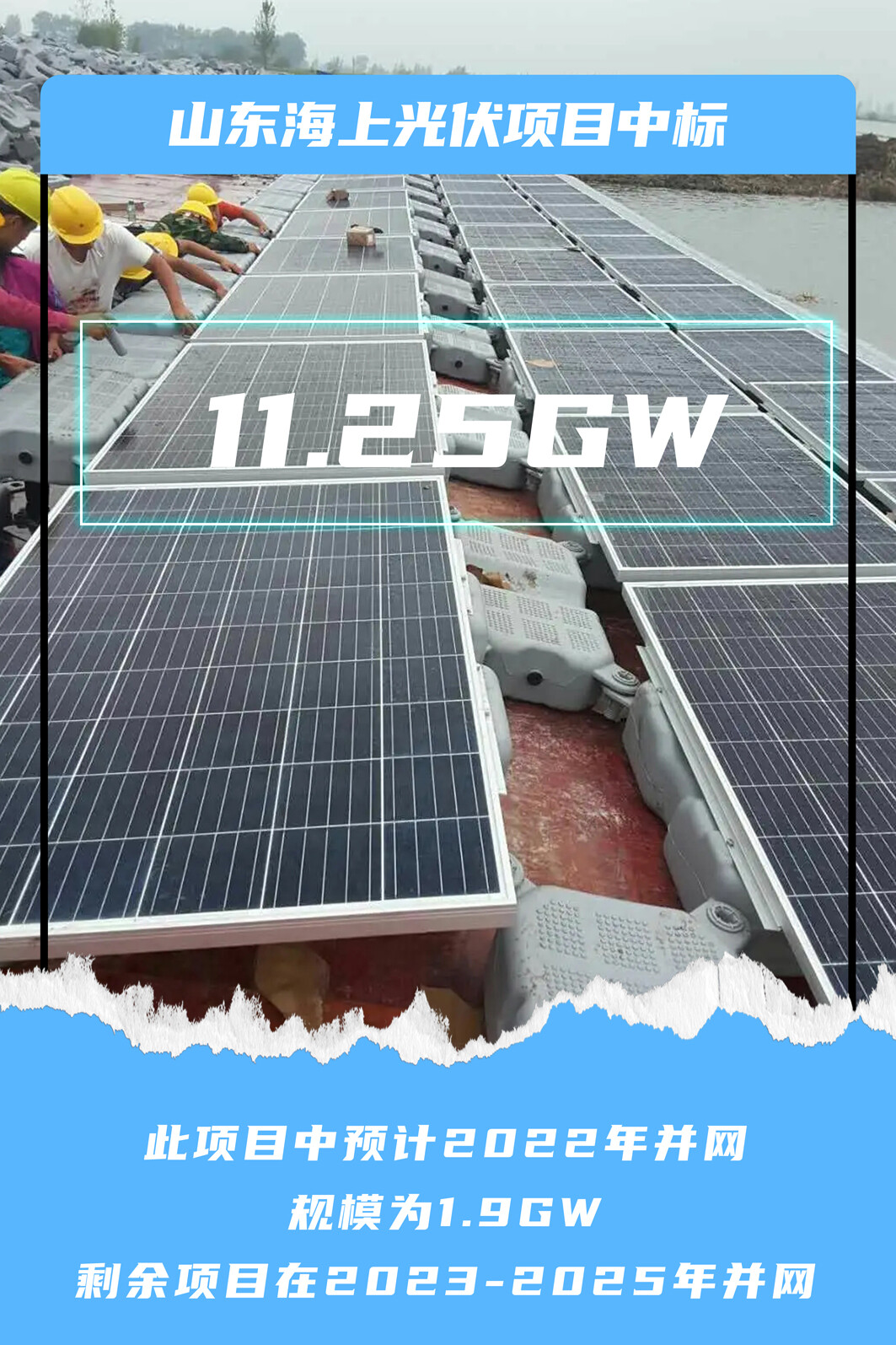 2022年6月17日,山东能源局公示了2022年度桩基固定式海上光伏项目竞争配置中标企业。山东省2022年度海上光伏项目包括10个海上光伏场址,总装机1125万千瓦。