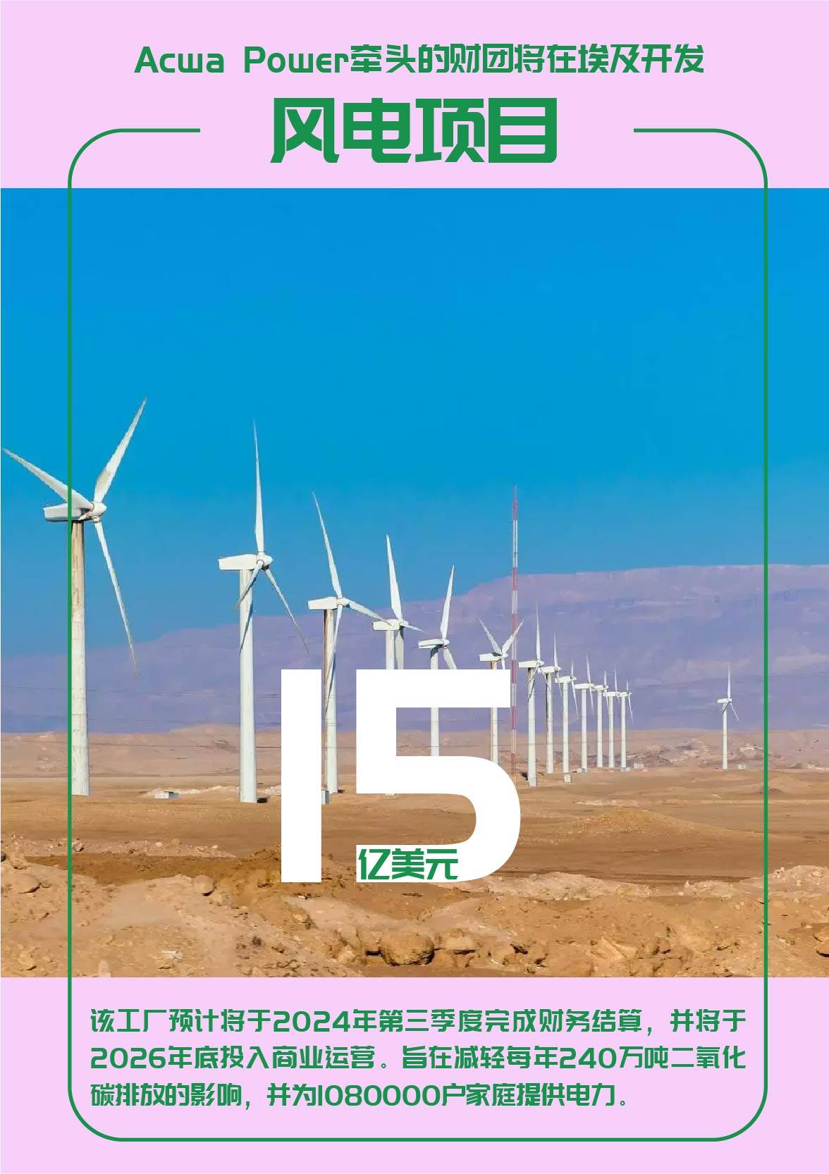 Acwa Power董事长Mohammad Abunayyan说,我们很荣幸通过这个具有里程碑意义的风电项目为加强沙特阿拉伯、我们的家园和埃及之间的联系做出贡献,并衷心感谢两国领导人相信我们有能力实现他们的可再生能源任务。尽管全球经济动荡,这个风能项目表明了实现更环保明天的承诺,我们期待与志同道合的合作伙伴合作,共创美好未来。