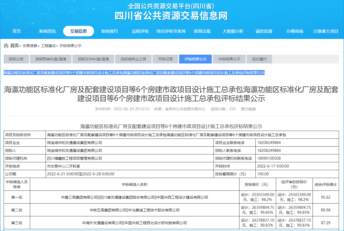 2022年6月20日,四川省公共资源交易信息网发布海瀛功能区标准化厂房及配套建设项目等6个房建市政项目设计施工总承包海瀛功能区标准化厂房及配套建设项目等6个房建市政项目设计施工总承包评标结果公示,中标候选人第一名中建三局集团有限公司、四川省交通建设集团股份有限公司、中国华西工程设计建设有限公司,项目总投资暂定为32.3亿元。