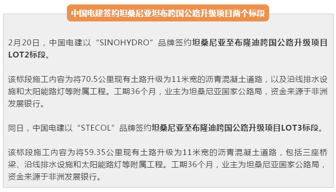 近日,中国电建以两个不同的品牌中标坦桑尼亚公路近60公里项目两个标段,成功拿下该项目。坦桑尼亚市场对中国电建来说是很熟悉的,此前曾中标或完成水电站、公路等项目,在当地的影响力很大,因此这次中标也很顺利。