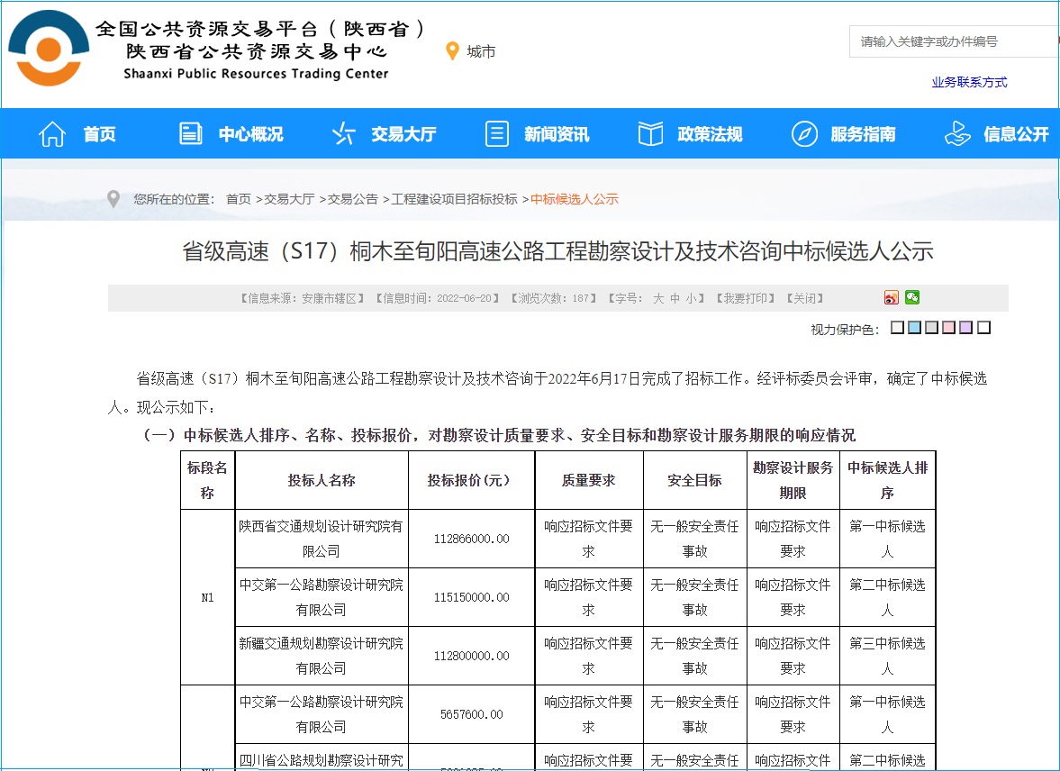 2022年6月20日,陕西省公共资源交易平台发布省级高速S17桐木至旬阳高速公路工程勘察设计及技术咨询中标候选人公示,项目N1标段由陕西省交通规划设计研究院有限公司中标,N2标段由中交第一公路勘察设计研究院有限公司中标,项目总投资98.4亿元。
