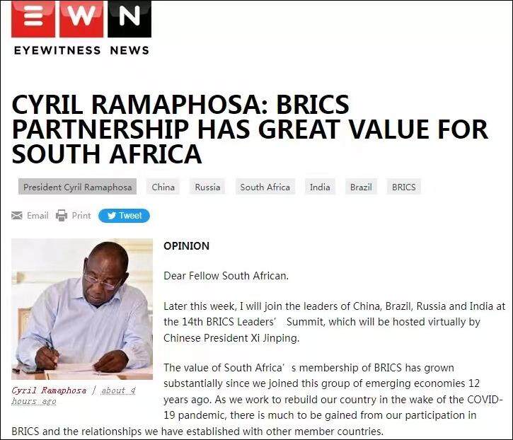 金砖国家领导人会晤为南非加强同伙伴国家联系、支持本国经济增长和创造就业提供了宝贵平台。更重要的是,这次首脑会议是南非为一个更美好的世界作出贡献的机会,在这个世界中,所有国家都有更好的机会从这一大流行病中恢复并繁荣发展。(转载请注明见道网www.seetao.com)见道网战略栏目编辑/许生鹏