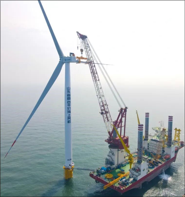 2022年6月21日,山东能源集团渤中A场址50万海上风电场完成首台机组吊装,标志着中国海装为平价海上风电定制化设计的首款平台机型——H23X平台机组实现量产装机,再一次打破亚洲最长叶片装机记录。