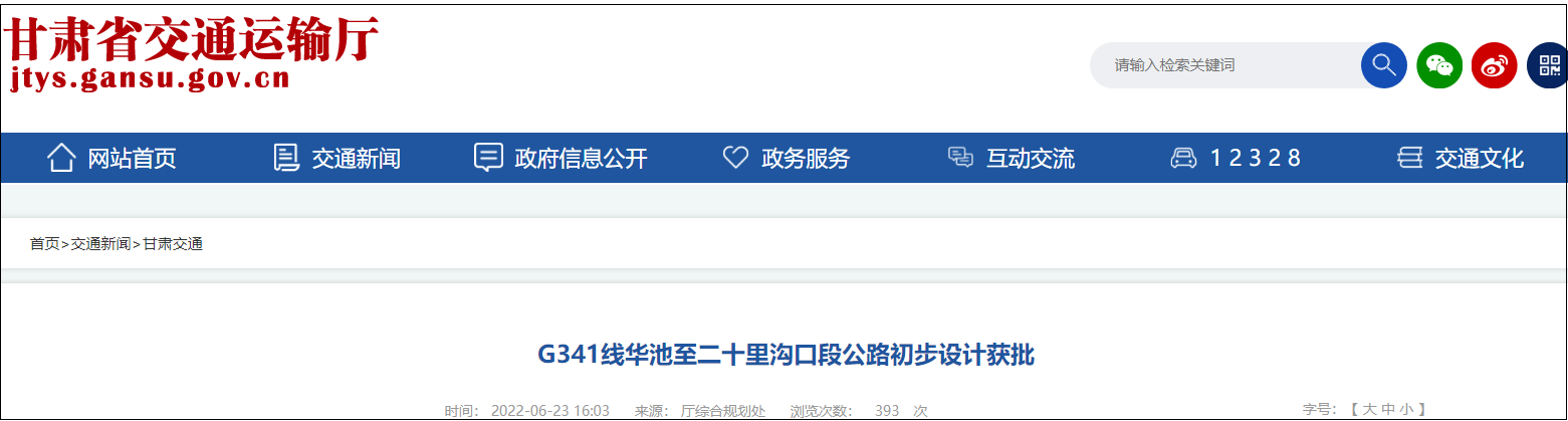 2022年6月23日,甘肃省交通运输厅正式批复G341线华池至二十里沟口段公路初步设计。