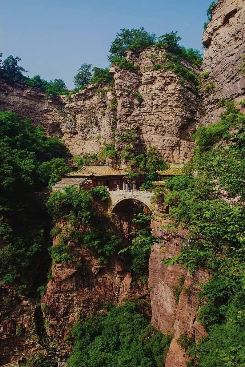在两壁断崖之上凌空架有三座单孔石拱桥,桥上还建有楼殿。