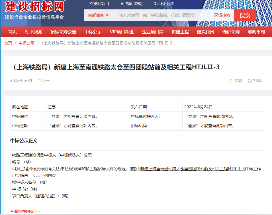 On June 24, 2022, the Jiangsu Provincial Construction Project Tendering Network released the announcement of the winning candidates for the newly built Shanghai-Nantong Railway Taicang-Situan Section and related projects. The project is divided into 5 bidding sections, and the 24th Bureau Group Co., Ltd., Shanghai Tunnel Engineering Co., Ltd. and other 6 units won the bid, with a total bid price of about 11.02 billion yuan.