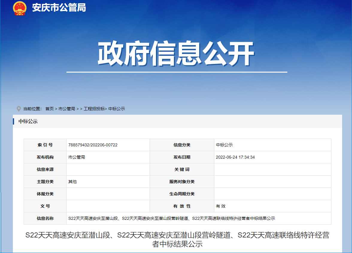 2022年6月24日,安庆市公共资源交易中心发布S22天天高速安庆至潜山段、S22天天高速安庆至潜山段营岭隧道、S22天天高速联络线特许经营者中标结果公示,项目由安庆市交通控股集团有限公司、安徽安通高速公路开发有限责任公司联合体中标,该项目收费期360 个月。