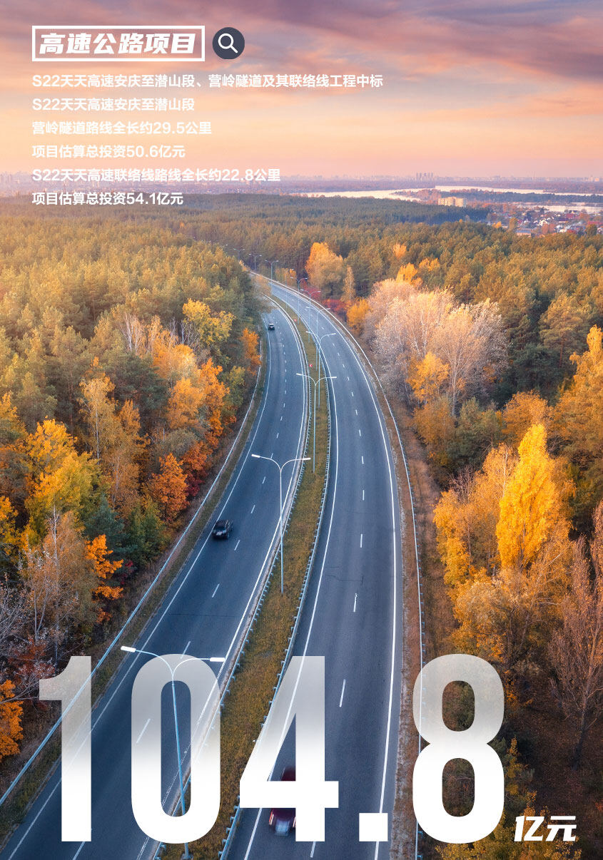 S22天天高速安庆至潜山段、S22天天高速安庆至潜山段营岭隧道路线全长29.5公里,S22天天高速联络线路线全长22.8km,项目推荐方案估算总投资104.8亿元。