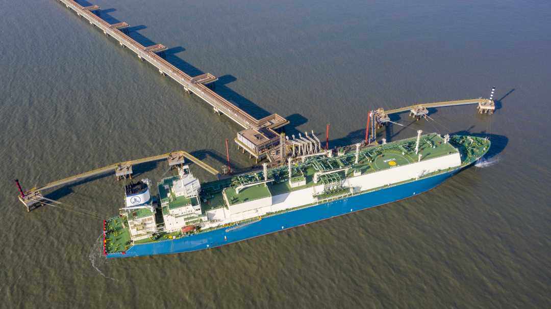 一艘液化天然气船靠泊在唐山港曹妃甸港区中石油液化天然气接收站码头卸载
