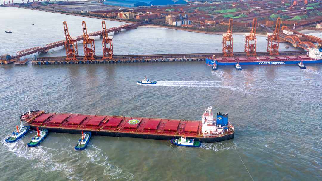 رصيف باخرة في محطة الخام في منطقة ميناء Caofeidian في ميناء Tangshan بمساعدة زورق قطر