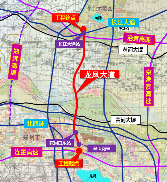 郑新高速(龙凤大道及跨黄河大桥)项目:位于G107和G107复线之间,拟定起点位于郑州市金水区,终点位于平原示范区。路线全长约18公里。其中郑州境7.5公里,新乡境10.5公里,总投资约95亿元。郑新高速连接线工程位于平原示范区太行大道与平原大道交叉处,由北向南延伸,终点接郑新高速收费站区互通,长约161米,总投资764.55万。