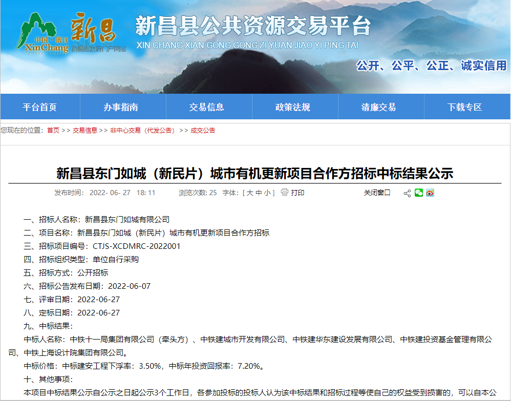 2022年6月27日,新昌县公共资源交易平台发布新昌县东门如城新民片城市有机更新项目合作方招标中标结果公示,项目由中铁十一局集团有限公司牵头、中铁建城市开发有限公司、中铁建华东建设发展有限公司、中铁建投资基金管理有限公司、中铁上海设计院集团有限公司联合中标。