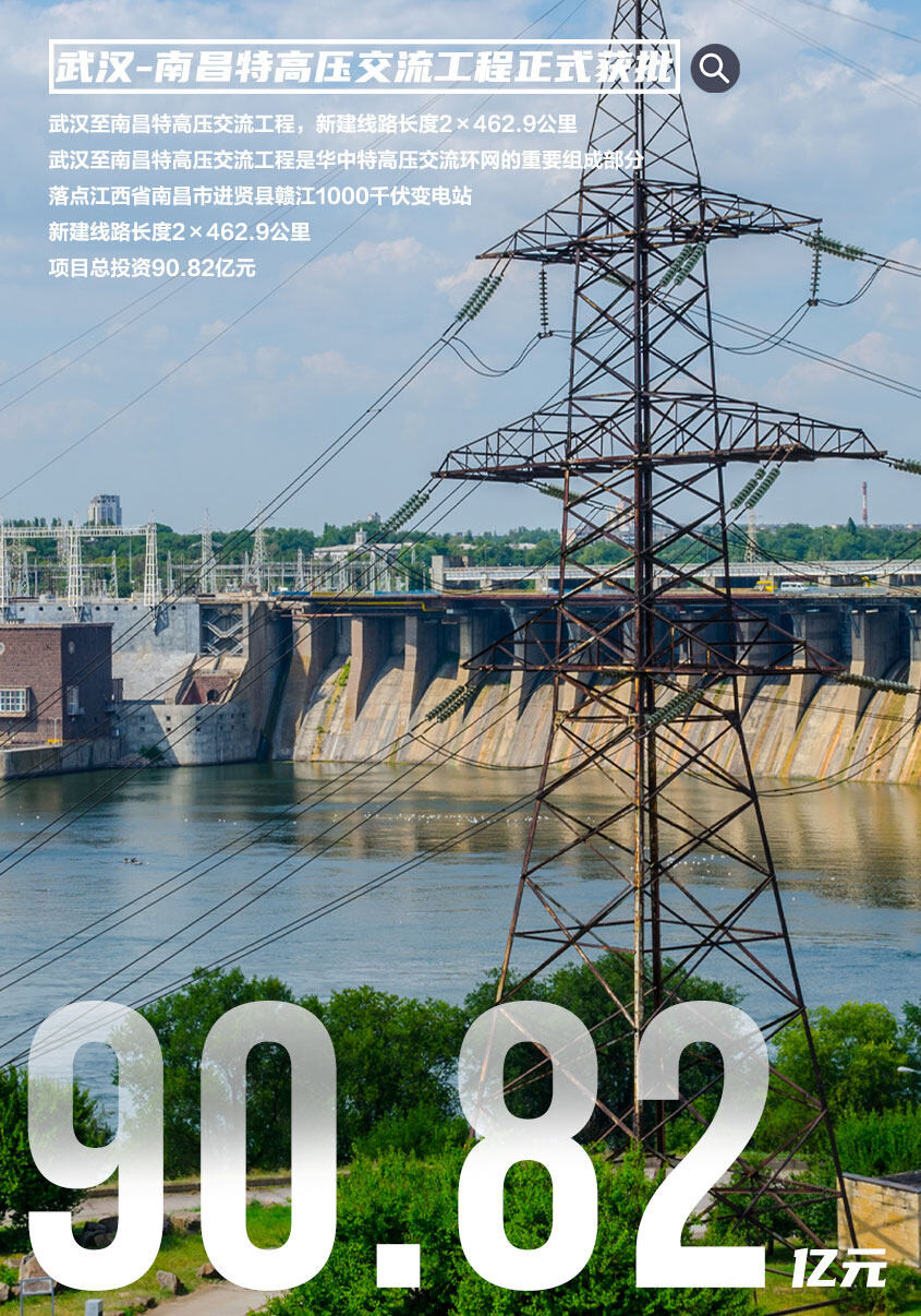 武汉至南昌特高压交流工程起于湖北省武汉市新洲区武汉1000千伏变电站,落点江西省南昌市进贤县赣江1000千伏变电站,新建线路长度2×462.9公里,项目总投资90.82亿元。线路在江西省境内长约2×251.6公里,途经九江瑞昌市、德安县、永修县,南昌市新建区、高新区、南昌县、进贤县,涉及2市7县(区)。该项目于2015年启动前期工作,建成后江西电网将形成完整的特高压交流骨干网架,充分融入中国特高压输电格局。