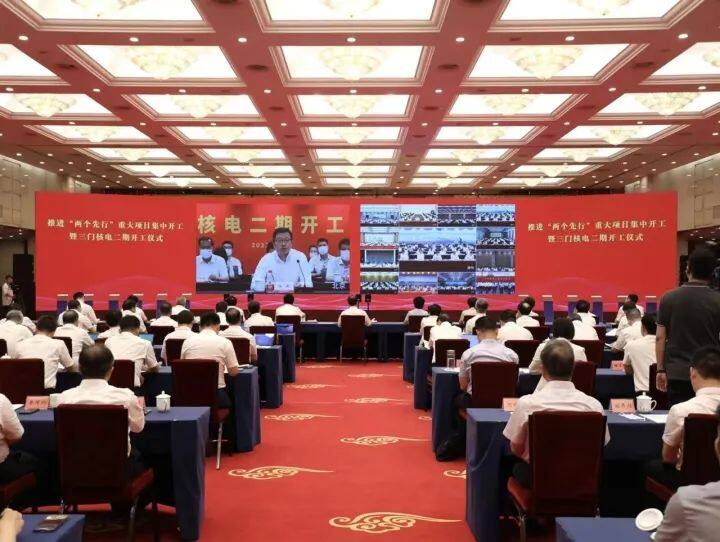 2022年6月28日上午,浙江省实现经济稳进提质、推进“两个先行”重大项目集中开工暨三门核电二期开工仪式在省人民大会堂举行。开工活动以视频连线形式举行,11个市分别设置了分会场。据介绍,这是2022年第二次重大项目集中开工。早在2022年1月5日,浙江已举行第一次重大项目集中,为2022整年经济稳进提质打下坚实基础。