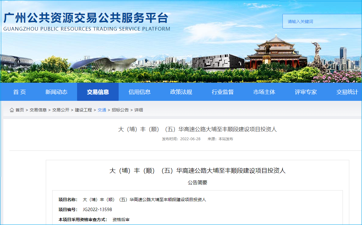 2022年6月28日,广州公共资源交易中心发布大埔—丰顺—五华高速公路大埔至丰顺段建设项目投资人招标中标公告,所属行业公路,招标人广东省交通运输厅,项目总投资约149.08亿元。