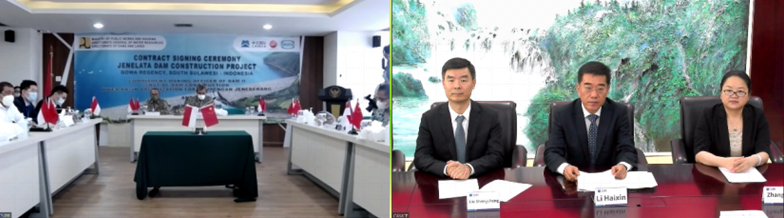 项目签约仪式通过视频连线的形式在印尼和北京两地举行。中工国际印尼总代表姬晓军和项目业主代表穆罕穆德瑞扎先生分别在合同上签字。印尼公共工程与住房部水资源司司长加洛特和中工国际党委副书记、总经理李海欣见证项目签约。