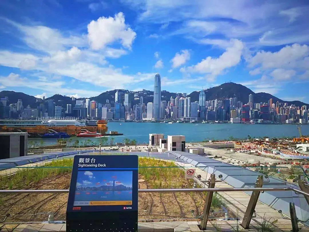 站在西九龙站站房顶端观景台鸟瞰香港