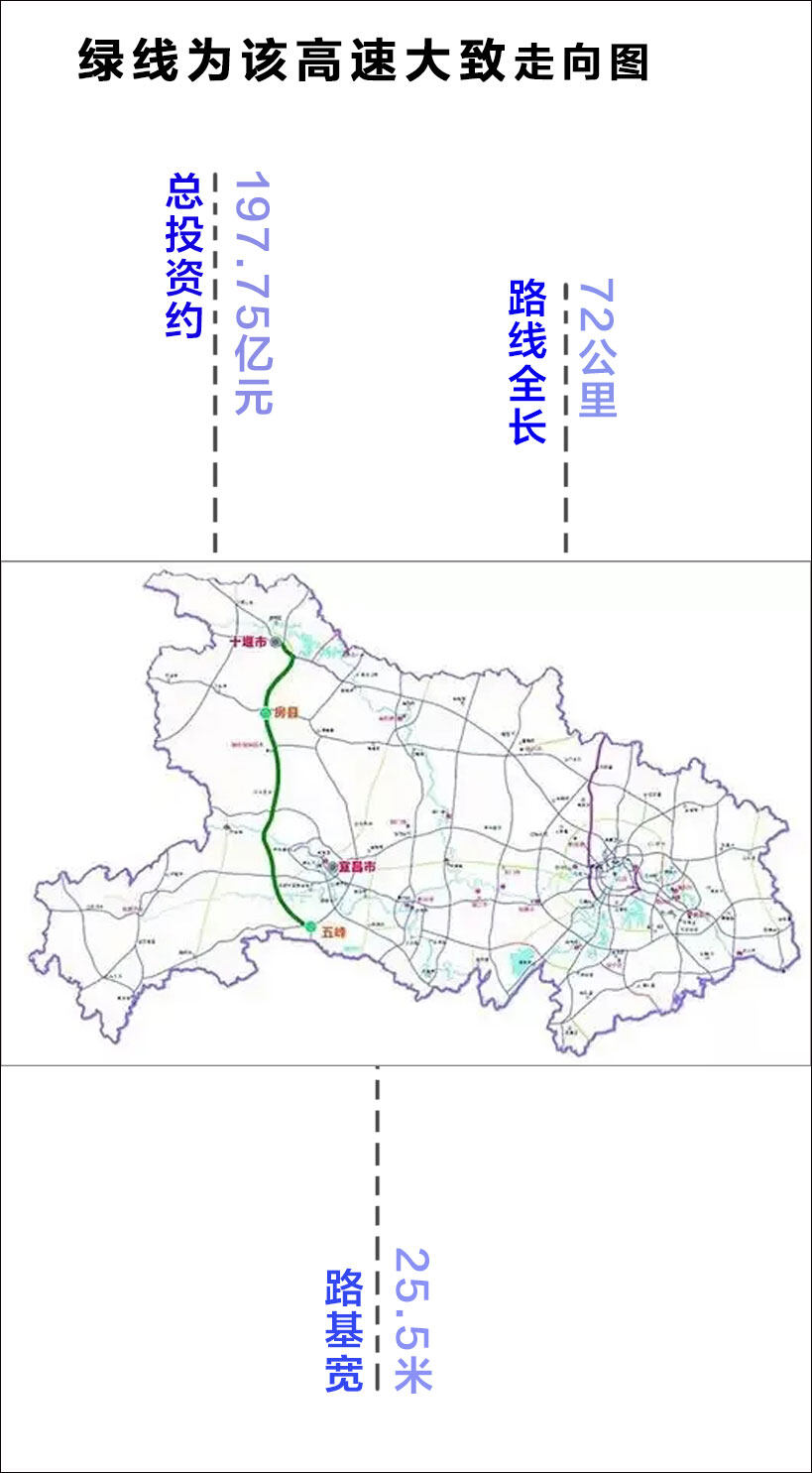 本项目路线起点位于兴山县峡口镇,在沪蓉高速公路兴山互通西侧约2.3公里处与沪蓉高速交叉,设置平邑口枢纽互通,起点向北与十宜高速公路兴山段顺接;路线向西南展线,经柏树垭、王家桥,在水田坝乡北侧处设水田坝互通,经水田坝乡西侧,在泄滩乡东侧跨长江至沙镇溪镇东侧设置沙镇溪互通,在周家坝处跨越童庄河,经上和坪至胡家湾设置郭家坝互通,路线穿过白杨山,跨越西沟河,在九畹溪镇西侧的田家坪设置九畹溪互通,在杨林桥镇东侧的学堂坪设置杨林桥互通,路线向南经磺腊坪,在秦家湾设置杨林桥服务区,路线向南经下林家湾、响铃、南湾,在屋场坪上跨宜万铁路,向南展线在现有贺家坪互通以西约5公里处与沪渝高速公路交叉,设置终点互通,终点向南与十宜高速长阳至五峰段顺接。