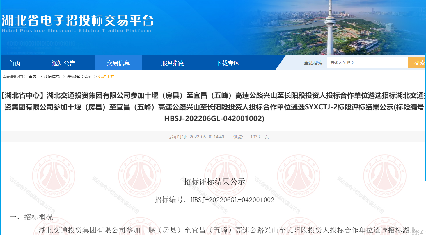 On June 30, 2022, the Hubei Electronic Tendering and Bidding Trading Platform released the announcement of the results of the selection and evaluation of investors’ bid cooperation units for the Xingshan-Changyang section of the Shiyan-Yichang Expressway. The project is divided into 7 sections, and the 6th section does not Included in this selection, the project was won by 7 units including China Railway 11th Bureau and CCCC Second Highway Engineering Bureau Co., Ltd., with a total investment of about 19.775 billion yuan.