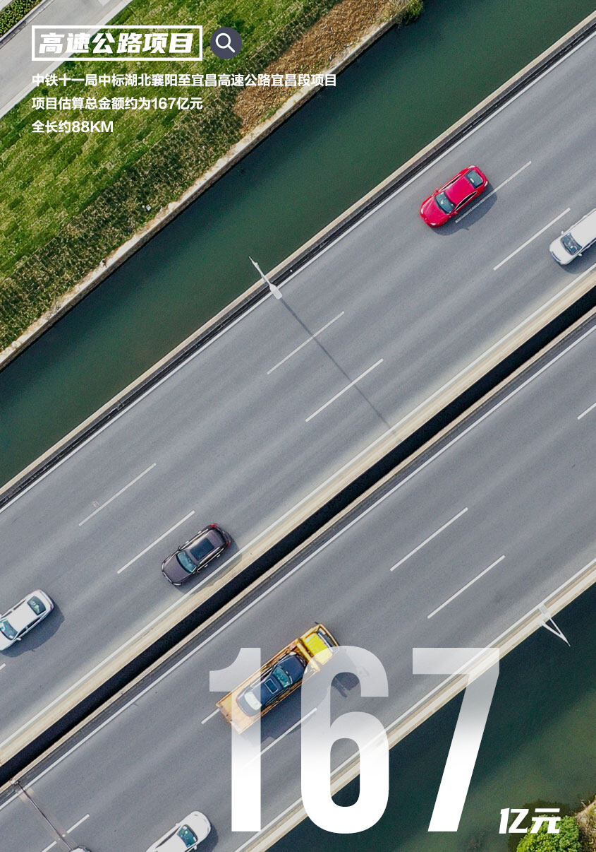 2022年6月30日,湖北省电子招投标交易平台发布襄阳至宜昌高速公路宜昌段投资人投标合作单位遴选评标结果公示,该项目分为6个标段,第4标段不纳入此次遴选。项目由中铁十八局集团有限公司、中交第四航务工程局有限公司等5家单位中标,项目估算总金额约为167亿元。