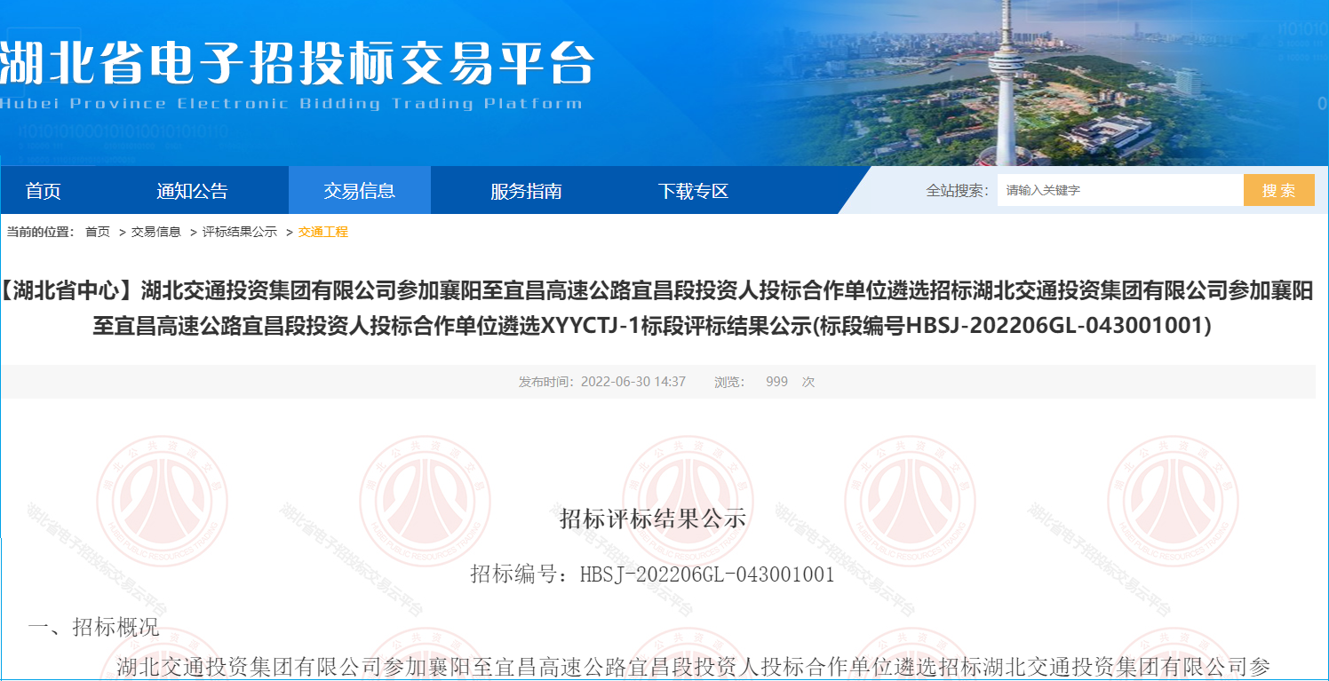 On June 30, 2022, the Hubei Electronic Bidding and Bidding Trading Platform released the announcement of the results of the selection and evaluation of investors' bidding and cooperation units for the Yichang section of the Xiangyang-Yichang Expressway. The project is divided into 6 bidding sections, and the 4th bidding section is not included in this time. selection. The project was won by 5 units including China Railway 18th Bureau Group Co., Ltd. and CCCC Fourth Navigation Engineering Bureau Co., Ltd., and the estimated total amount of the project is about 16.7 billion yuan.