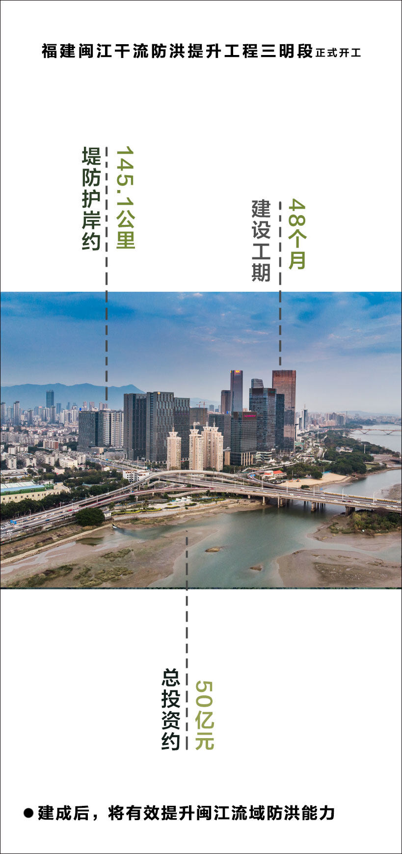 The flood control improvement project on the main stream of the Minjiang River involves Cangshan District, Minhou County, Fuzhou City, Sanyuan District, Shaxian District, Yongan City, Qingliu County, Ninghua County and Youxi County of Sanming City, with a total construction period of 48 months. The construction content includes about 145.1 kilometers of new and upgraded embankments (revetments), of which about 56.1 kilometers of new embankments, about 46 kilometers of upgraded and reconstructed embankments, and about 43 kilometers of new revetments; 7 new sluice gates, 1 dry gate, 2 pumping stations, One flood gate and two gate station equipment renovations, with an estimated total investment of 4.95 billion yuan. After the completion of the flood control improvement project on the main stream of the Minjiang River, the flood control and drainage engineering system in county-level urban areas and important townships along the main stream of the Minjiang River will be further improved.