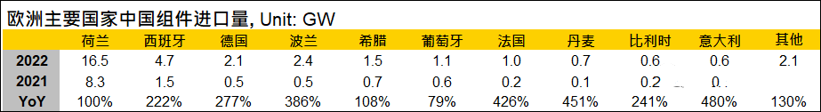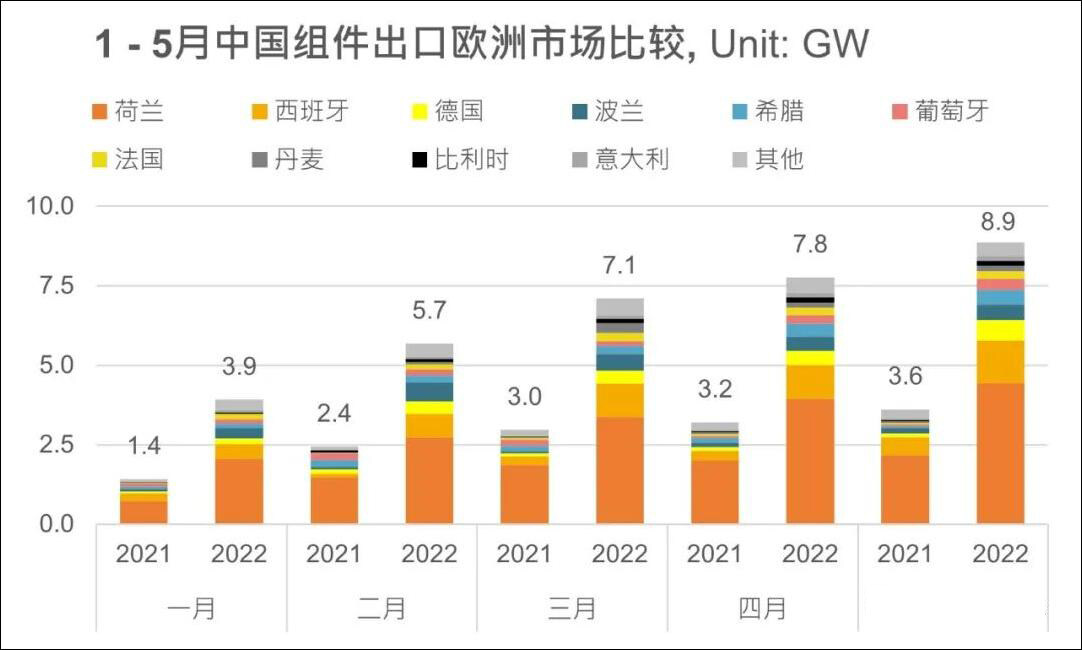 As of May, seven countries have imported more than 1GW of PV modules from China. Among them, the Netherlands, the largest importer and a major European transshipment port, has even imported 16.5GW of modules, a year-on-year increase of 100%. 4GW of component demand is expected. In 2022, Germany and Spain, the top two in the European market for module demand, imported a total of 2.1 and 4.7GW of modules, and the year-on-year growth has more than doubled. Germany and Spain are expected to have a module demand of 7.0GW in 2022. Other countries with estimated module demand exceeding 1GW, such as Poland, Greece, Portugal and France, have also imported more than 1GW of Chinese modules.