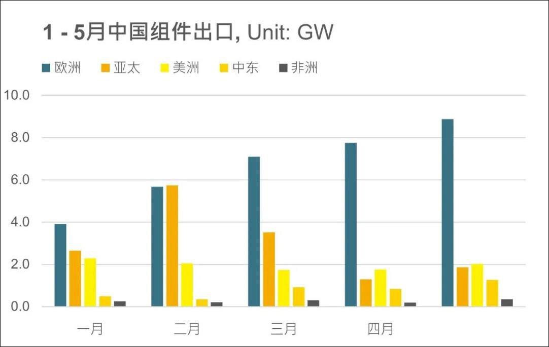 From the perspective of geographical divisions, China's module exports from January to May in each of the major regional markets have grown quite strongly, with an increase of more than 40% compared to the same period last year. On the whole, except for the Asia-Pacific market, which has fluctuated greatly after India imposed BCD tariffs in April, the demand for Chinese modules in other regional markets is relatively stable, and the European market is growing month by month.