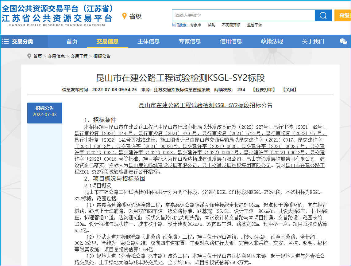 On July 3, 2022, the Jiangsu Provincial Public Resource Trading Network released the bidding announcement for the KSGL-SY2 tender section of the highway engineering test and inspection under construction in Kunshan City, the industry highway, the tenderers Kunshan Luda Changcheng Construction Development Co., Ltd. Group Co., Ltd., with a total investment of 8.2 billion yuan.