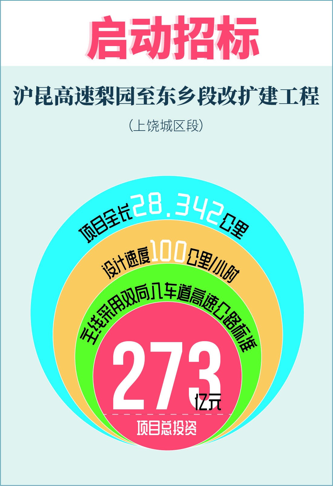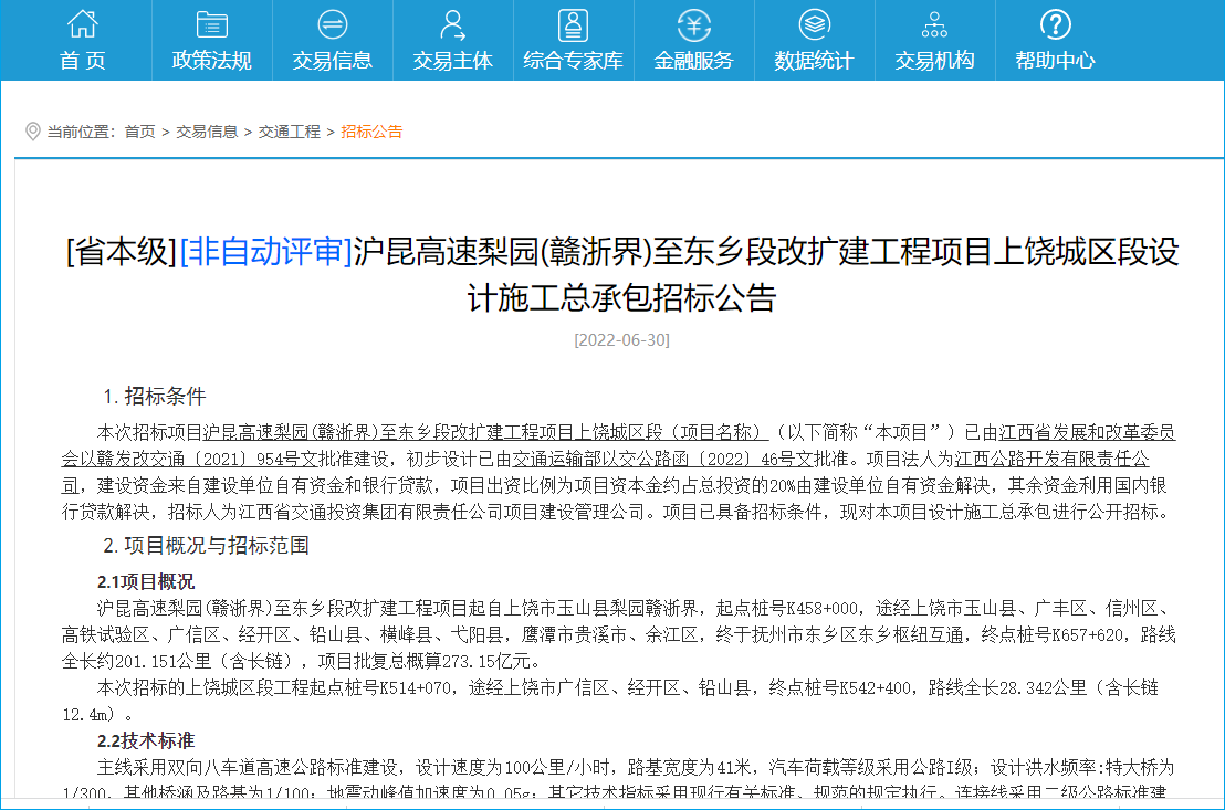 2022年6月30日,江西公共资源交易网发布沪昆高速梨园至东乡段改扩建工程项目上饶城区段设计施工总承包招标公告,所属行业公路,招标人江西省交通投资集团有限责任公司项目建设管理公司,项目总投资273.15亿元。