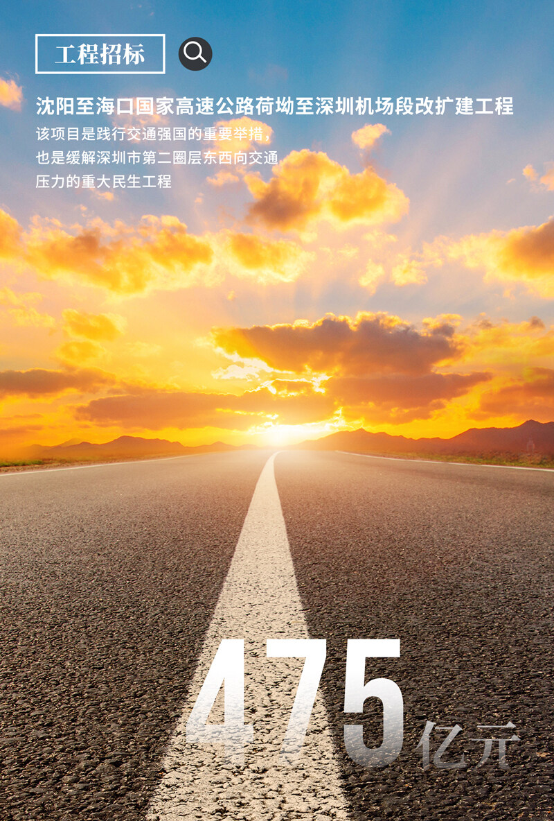 2022年6月29日,深圳市电子招投标交易平台发布沈阳至海口国家高速公路荷坳至深圳机场段改扩建项目主体工程施工招标公告,招标人 深圳高速公路集团股份有限公司,计划总投资475亿元。