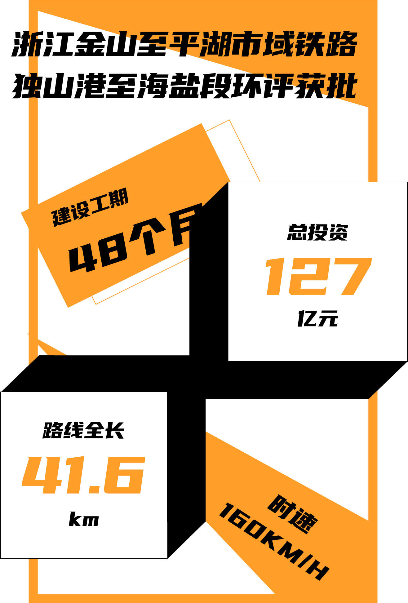 金山至平湖市域铁路(独山港至海盐段,即浙江段)起自上海市与浙江省省界,向西经平湖市独山港镇、乍浦镇、林埭镇、当湖街道、海盐县开发区(西塘桥街道),终至海盐县武原街道,总投资约127亿元,设计时速160公里/小时,建设工期48个月。