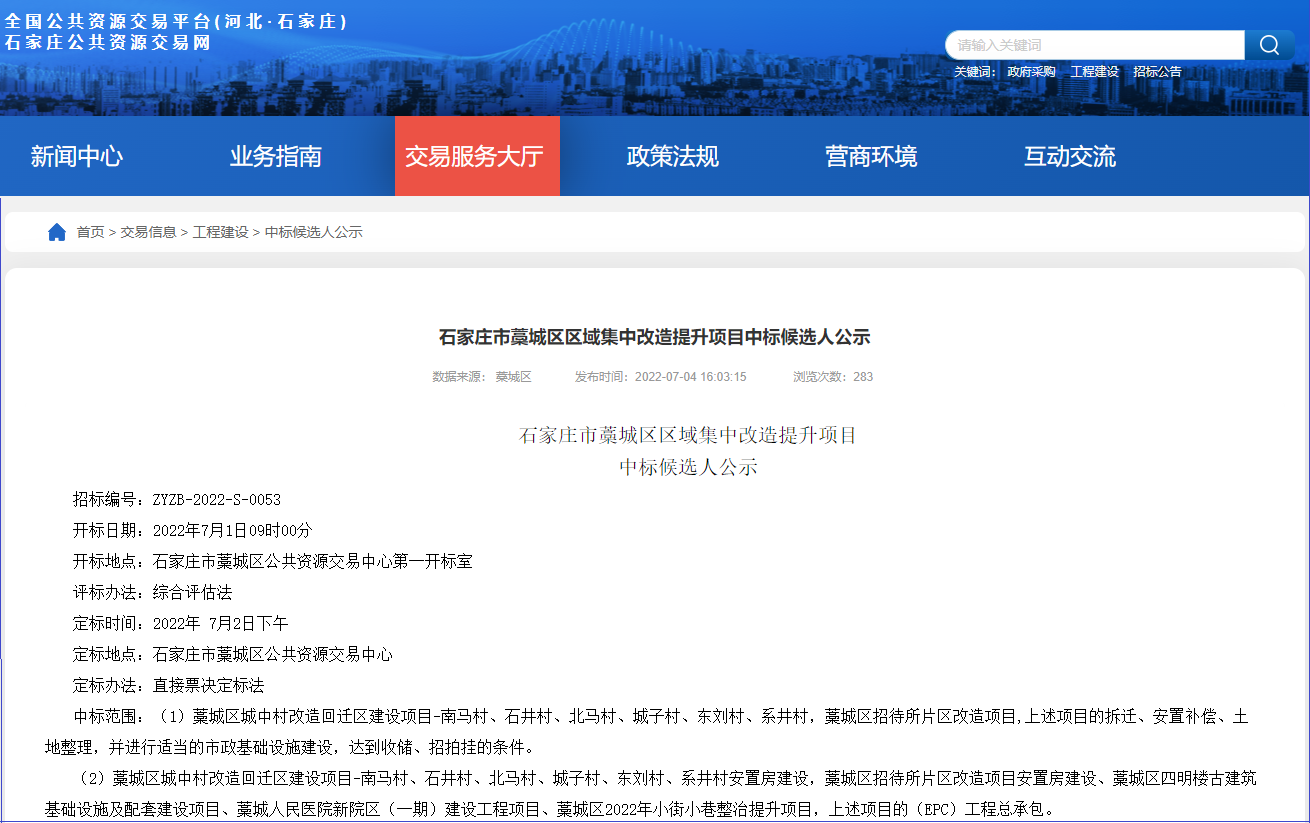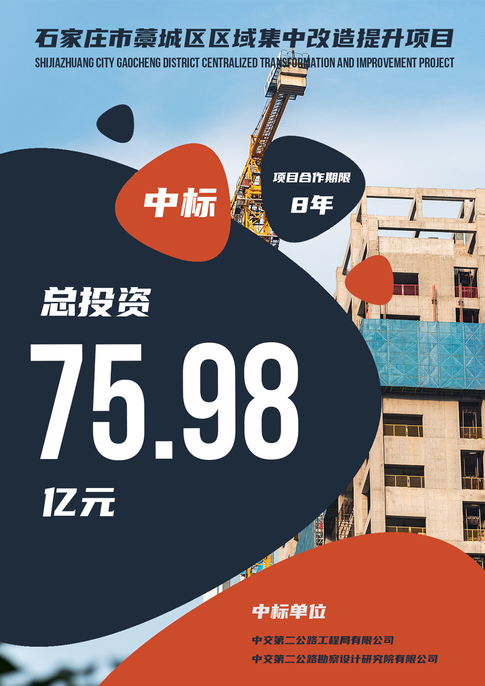 2022年7月4日,石家庄公共资源交易网发布石家庄市藁城区区域集中改造提升项目中标候选人公示,该项目由中交第二公路工程局有限公司、中交第二公路勘察设计研究院有限公司中标,工程总承包投标总报价75.98亿元。