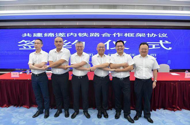 近日,绵遂内铁路沿线五市人民政府与蜀道集团在成都签署共建绵遂内铁路合作框架协议。蜀道集团副总经理李永林,绵阳市副市长袁明,德阳市副市长陈天航,遂宁市委常委、常务副市长杜海洋,内江市委常委、常务副市长何政,资阳市签约代表王忠伟出席签约仪式。