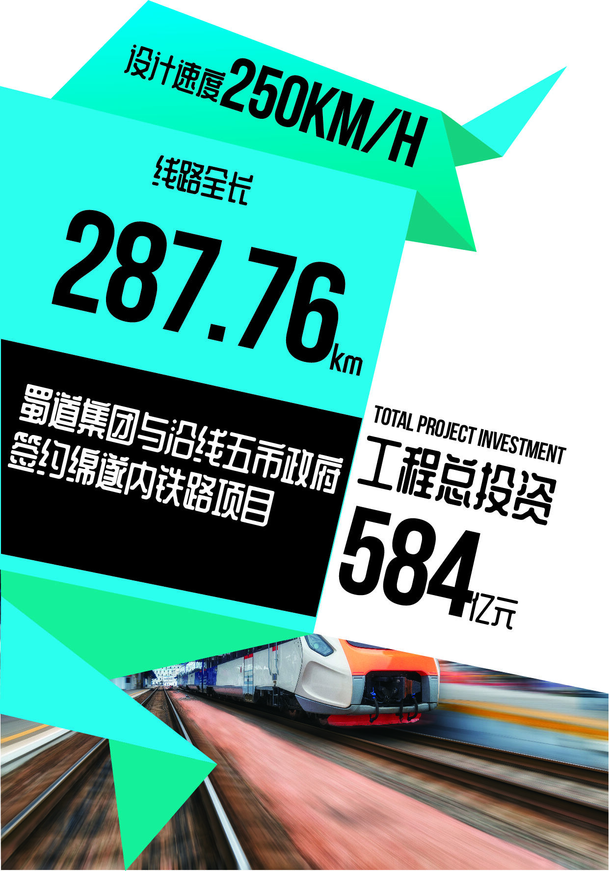 线路全长约287.76公里,遂宁市境内约93.5公里,其中射洪市境内约42.6公里,规划为客运专线,设计速度250公里/小时,预留350公里/小时,可研招标概算投资约584亿元,其中射洪段投资约86.4亿元。