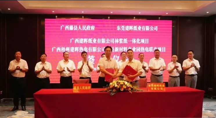On June 30, 2022, Guangxi Teng County and Dongguan Jianhui Paper Co., Ltd. held the forest-pulp-paper integration project of Guangxi Jianhui Paper Co., Ltd. and Guangxi Wuzhou Jianhui Paper Co., Ltd. Tengxian New Material Industrial Park in Wuzhou City The signing ceremony of the combined heat and power project marks that the two projects will start construction in an all-round way. This government-enterprise cooperation agreement will not only establish a new benchmark for high-level enterprises in Tengxian County, but will also effectively promote the economic restructuring and rural revitalization strategy of Tengxian County to achieve new leap-forward development.