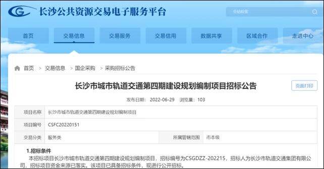 2022年疫后经济复苏带动各地重大项目建设投资不断扩大。近日,长沙市公共资源交易电子服务平台发布长沙地铁第四期建设规划编制项目招标公告。