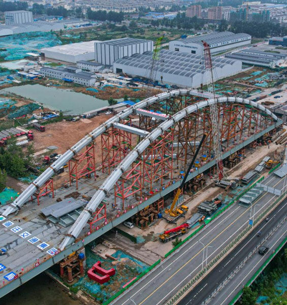 跨京杭大运河特大桥是该项目重难点控制性工程之一,整体采用三跨提篮式网状系杆钢拱桥结构,主跨172.5米,全桥共6道钢箱结构风撑,拱肋38根,拱肋中心高度28.75米,主桥重量达7152吨。