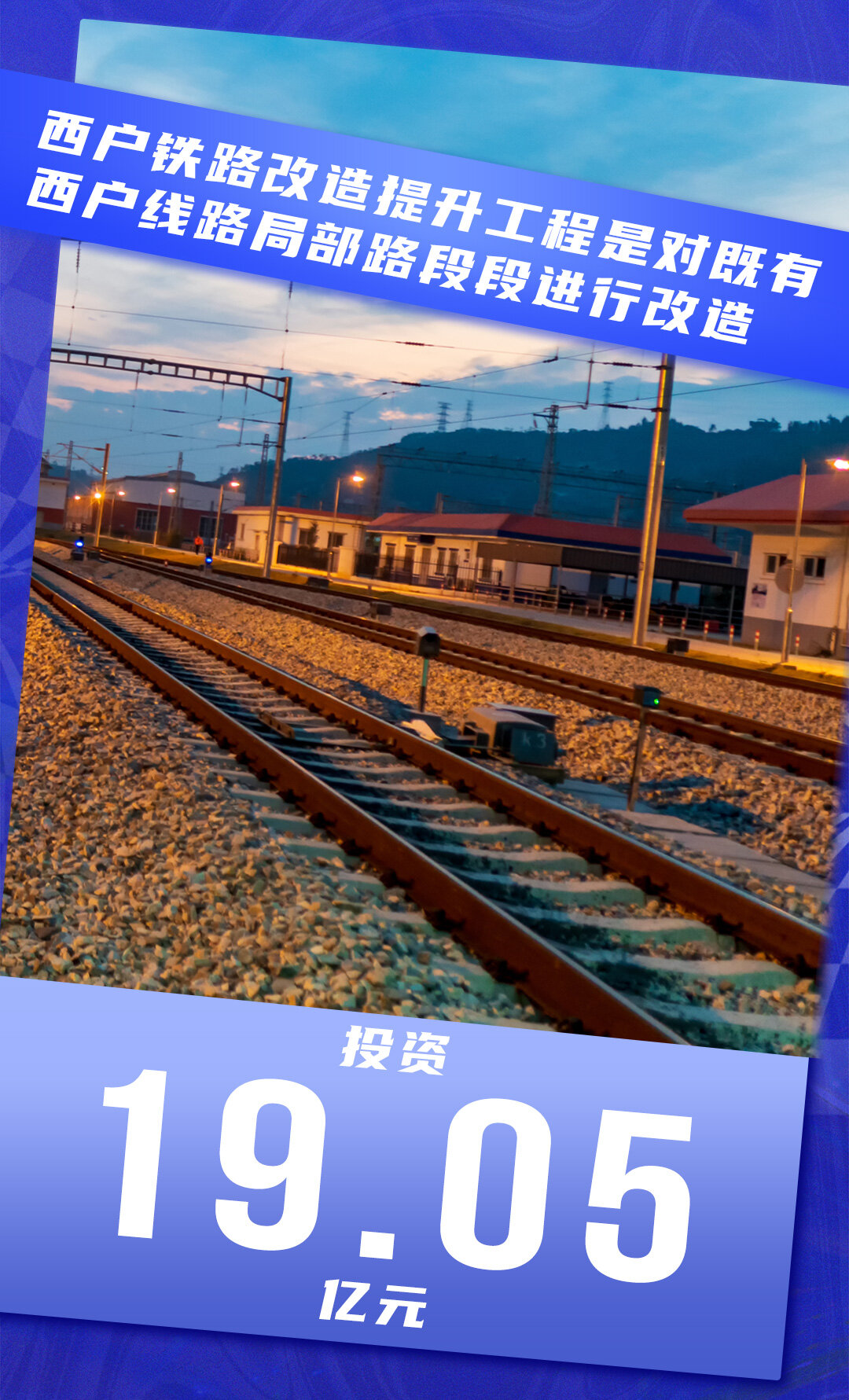 此次西户铁路改造提升工程是对既有西户线路局部路段段进行改造。改造线路起自阿房宫南站与地铁5号线阿房宫南站接驳,止于既有户县站。线路全长26.3km,设站5座,其中阿房宫南站、昆明池站和五竹站为新建车站,马王站和户县站为改造既有车站,同时对客运范围内的轨道、路基、桥梁、车站和机电设备及配套工程等进行改造。