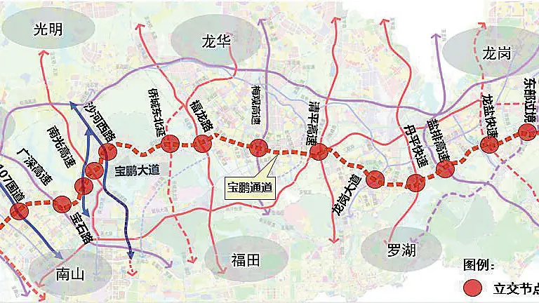 2022年7月9日,从深圳公共资源交易中心深圳宝鹏通道工程中标候选人已出炉,该通道规划为复合通道,其中主线定位为城市快速路,主要承担第二圈层宝安、龙华、龙岗及坪山等跨组团及组团间中、长距离客货运交通,完善路网结构。该项目将于2022年动工开建,预计2025年7月完成施工。